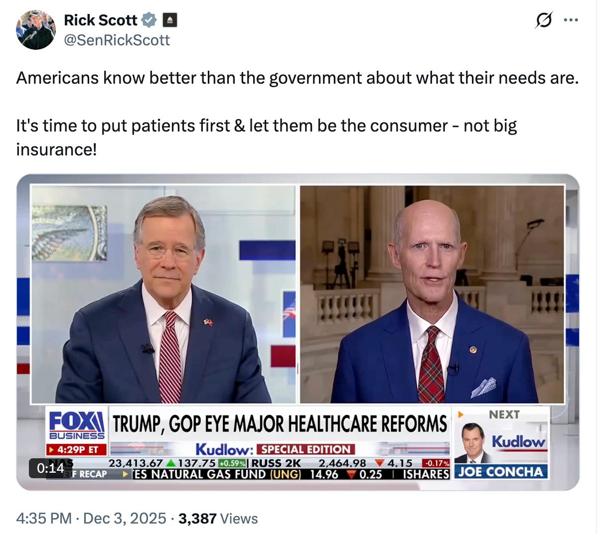 Sen. Rick Scott (R-FL), for example, announced his bill a couple of weeks ago, as one that will “fix Obamacare and drive down health care costs.”